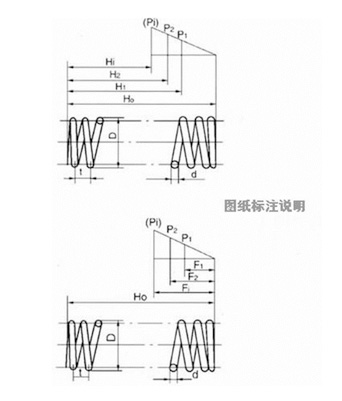 圖紙請注明:材料直徑(d),外徑(D)自由高度(Ho)總?cè)?n 1 ),工作圈數(shù)(n)、節(jié)距(t),螺旋方向:有左右旋之分,常用右旋,圖紙沒注明的一般用右旋。有負(fù)荷要求注上負(fù)荷(p 1 p 2…… p i )和對應(yīng)值( H1H2……Hj)或(F1F2……Fj)。